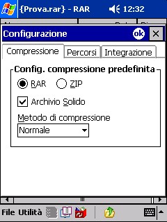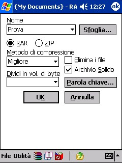 La creazione di un archivio compresso è semplice: basta, da Pocket RAR, selezionare i files e/o le cartelle da archiviare e selezionare il comando di archiviazione.